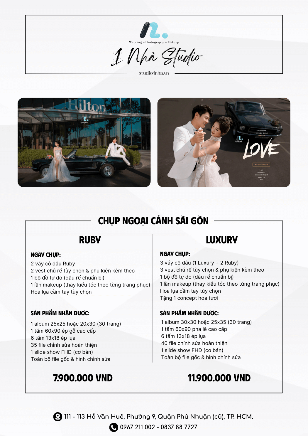 Studio 1 Nhà là nơi cung cấp những gói chụp ảnh ngoại cảnh siêu đẹp nổi tiếng tại Sài Gòn. Chúng tôi CAM KẾT không phát sinh thêm bất cứ phụ phí nào khác, giá đã bao gồm vé vào cổng tại các studio. Hãy lưu lại cho bản thân những bộ ảnh cưới đẹp lung linh như mơ với giá cực kỳ hấp dẫn này nhé. Đến với Studio 1 Nhà bạn sẽ nhận được những ưu đãi đặc biệt nhất: Studio 1 Nhà là địa chỉ đáng tin cậy được nhiều cặp đôi lựa chọn vì uy tín lâu năm trong ngành. Chúng tôi đem đến những bộ ảnh cưới mang màu sắc của riêng từng cặp đôi, đảm bảo độc đáo để bạn luôn tự hào khoe bạn bè và người thân. Đội ngũ thiết kế và ekip chuyên nghiệp giúp bạn lên ý tưởng cho những khung hình chất lượng nhất, chắc chắn sẽ khiến bạn hài lòng trong từng khoảnh khắc đáng nhớ này. Tiết kiệm được chi phí khi chụp ảnh với giá trọn gói. Tư vấn cụ thể cho từng đối tượng khách hàng khác nhau nhằm đáp ứng nhu cầu và sở thích của từng cặp đôi.